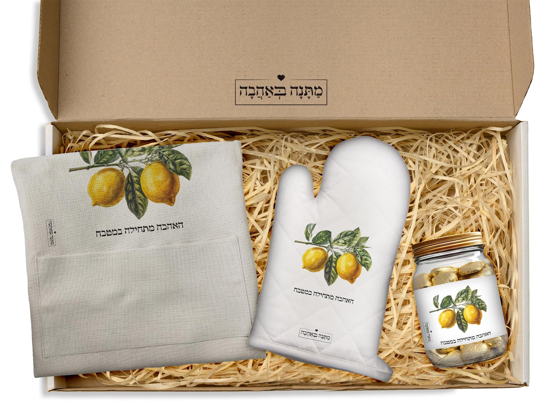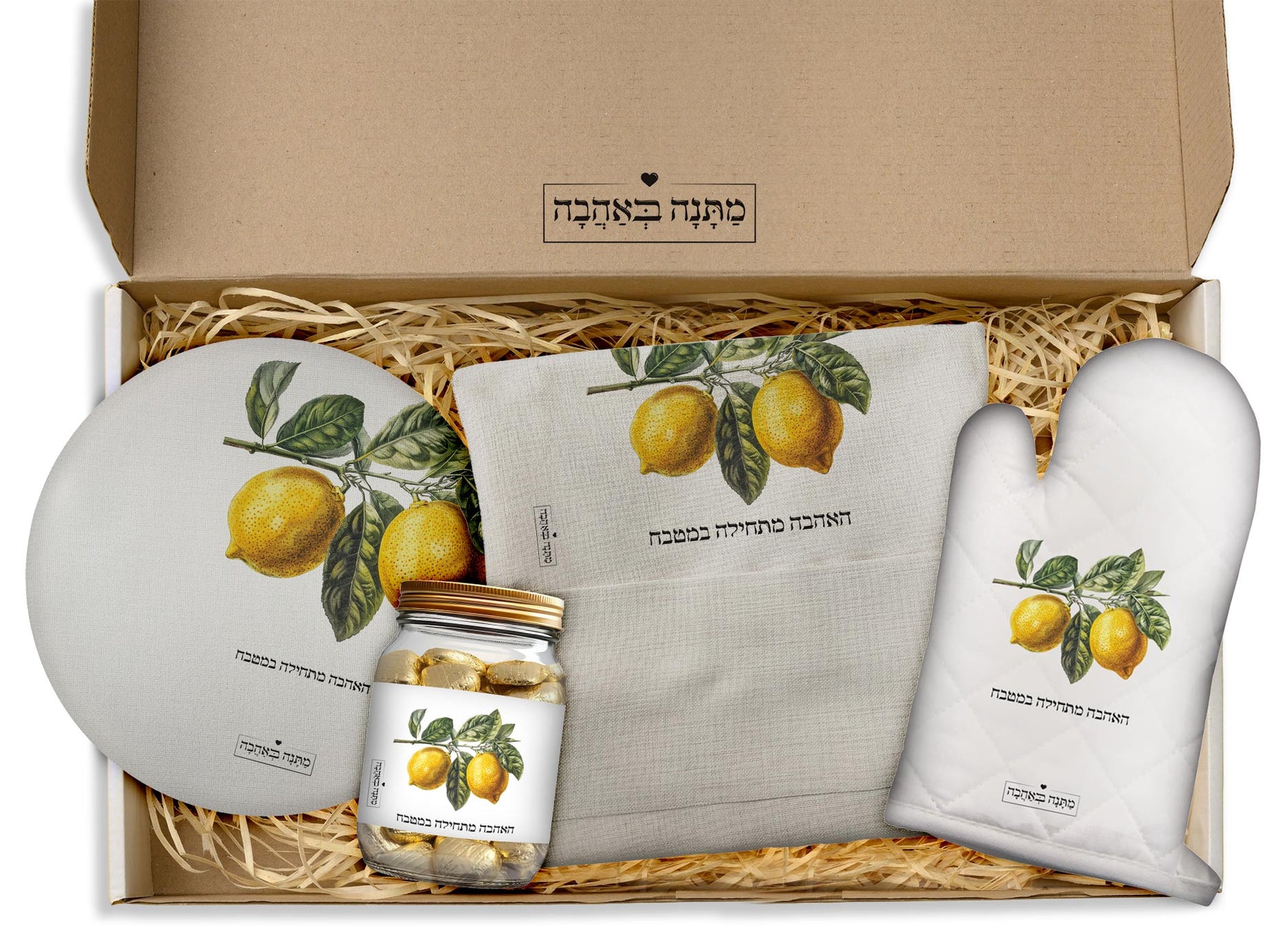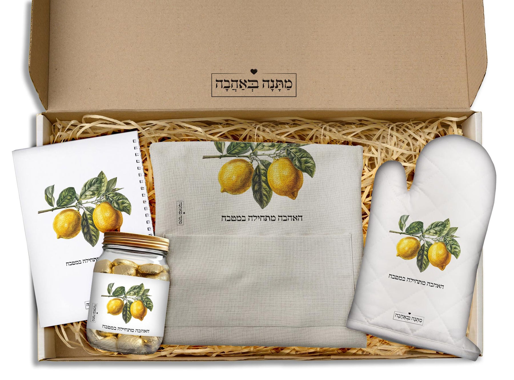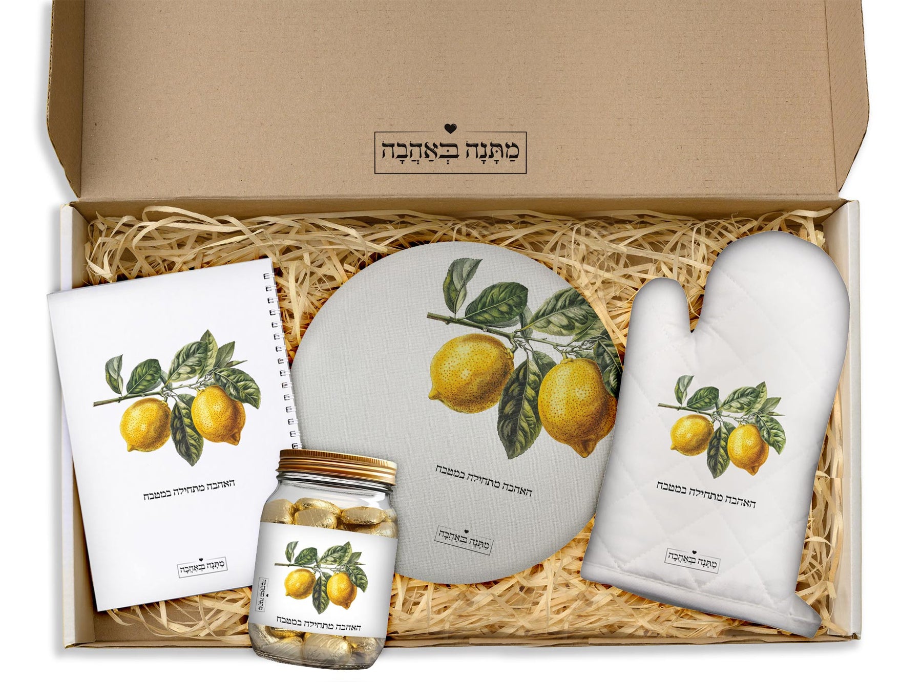 מארז מתנה למטבח כולל שם והקדשה אישית - דגם לימונים (כל הגדלים)