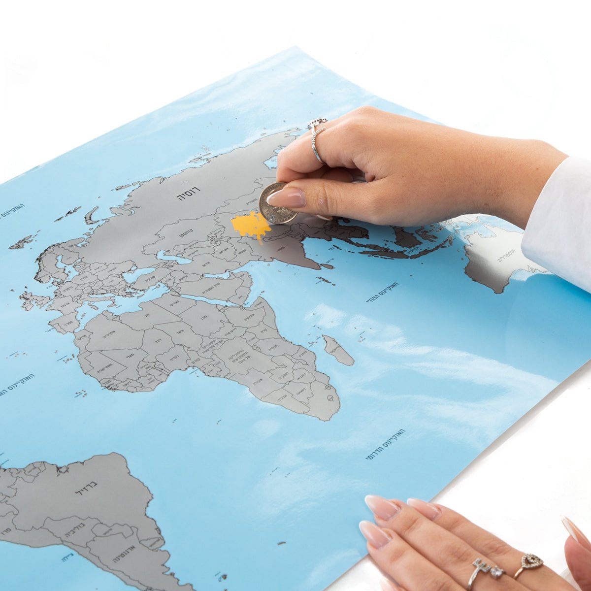 מפת כדור הארץ, מכוסה בשכבה לגירוד בצבע, גירוד קל באמצעות מטבע.