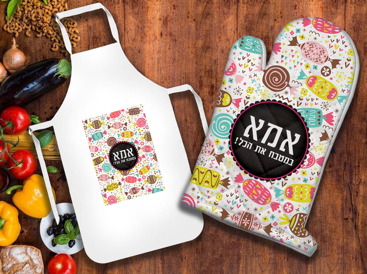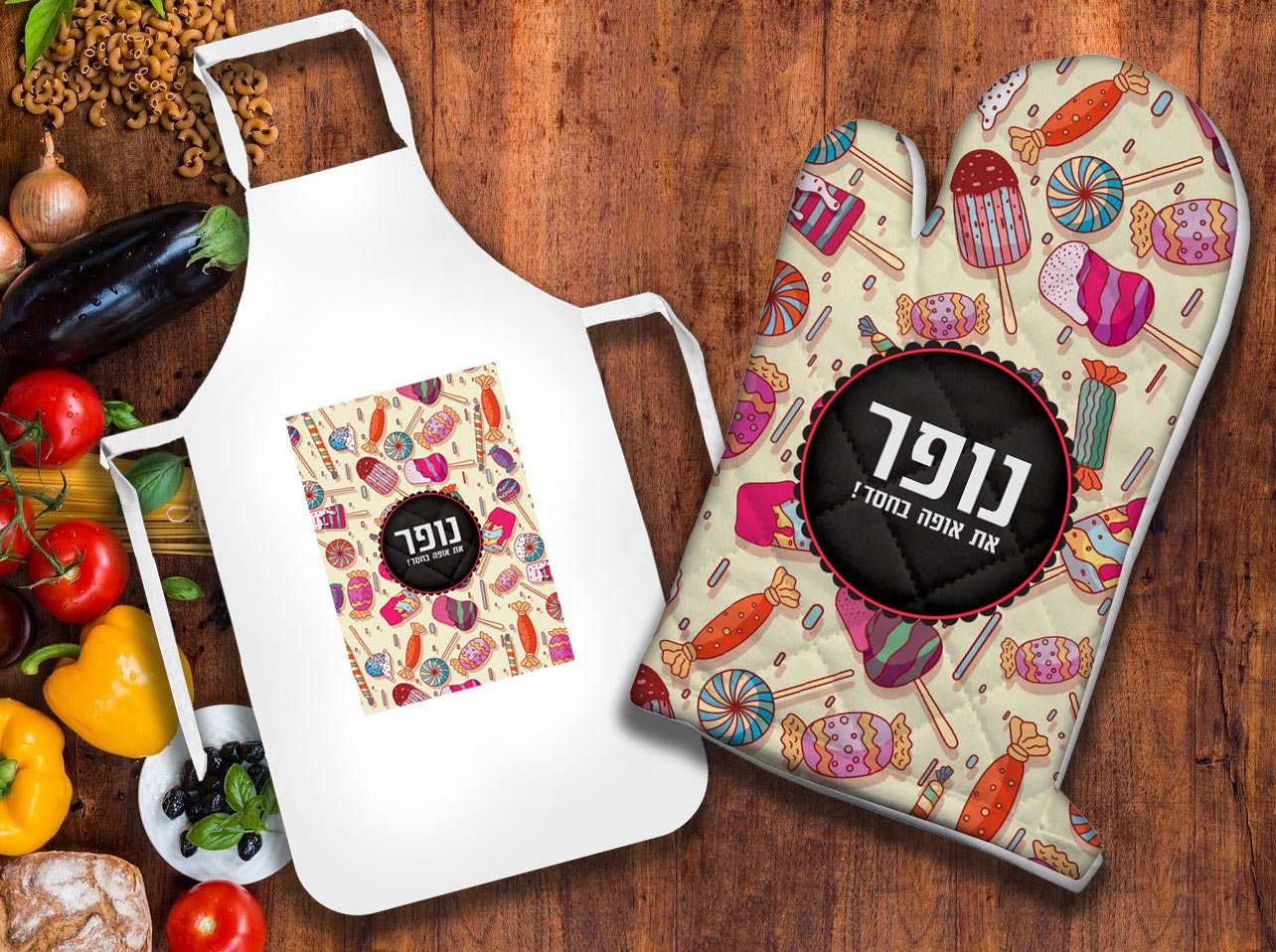 כפפה מעוצבת להוצאת מוצרים חמים מהתנור+ סינר מטבח מקורי.