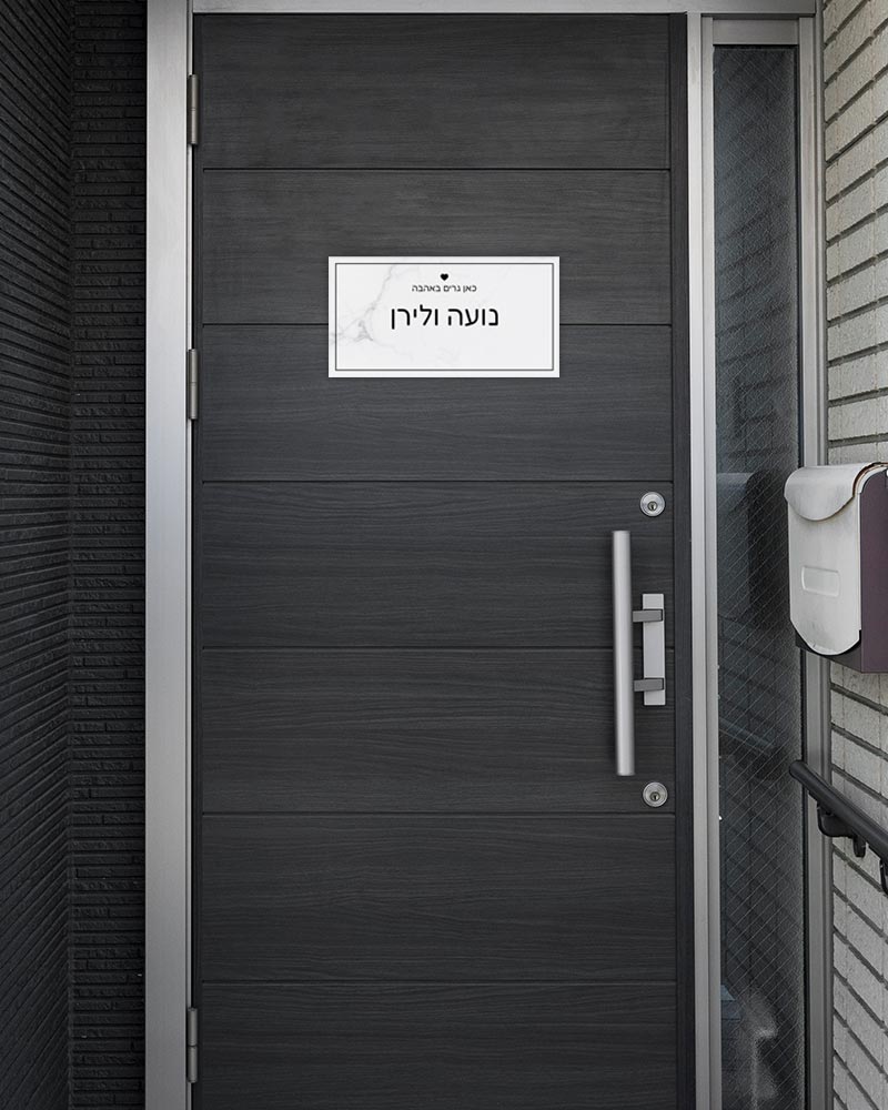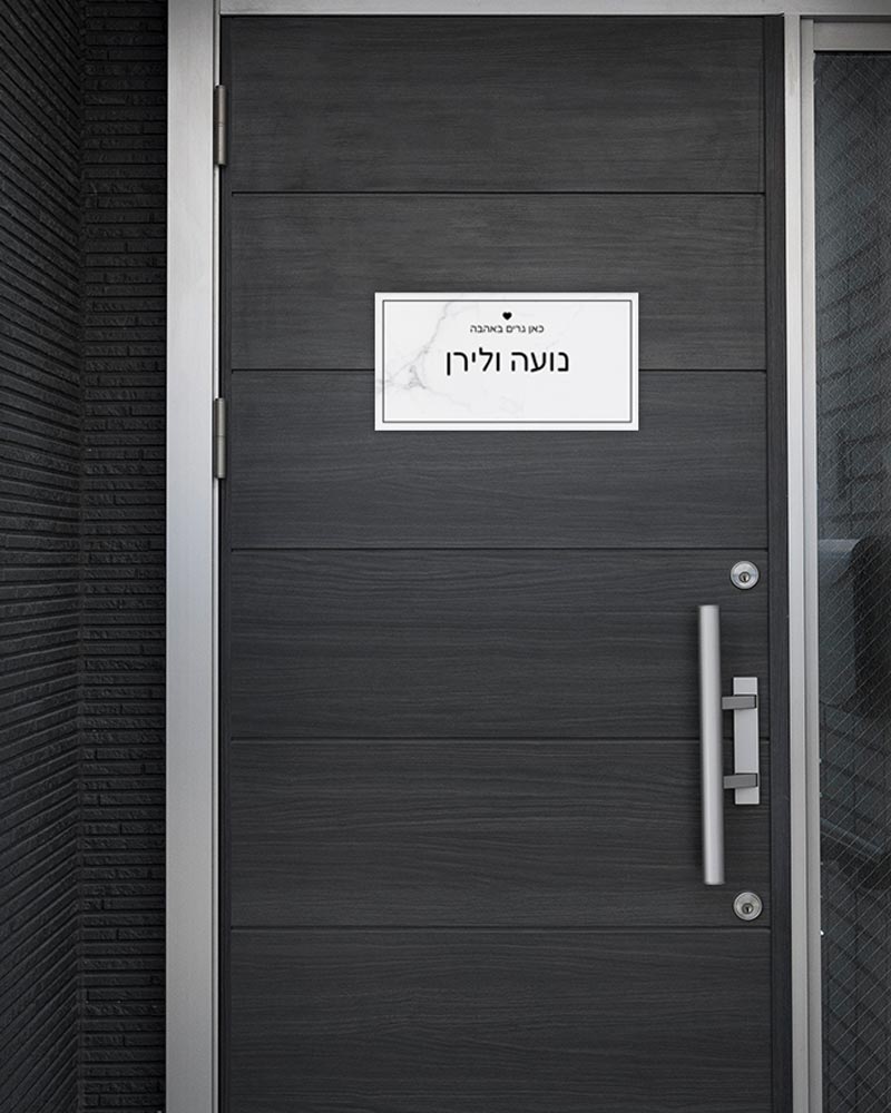 שלט עץ מלבני לדלת הבית בכיתוב שמות בני הזוג- דגם שיש לבן