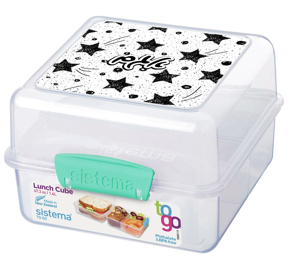 קופסת אוכל מחולקת ומעוצבת במגוון עיצובים עם שם הילד, מבית המותג הניו-זילנדי Sistema