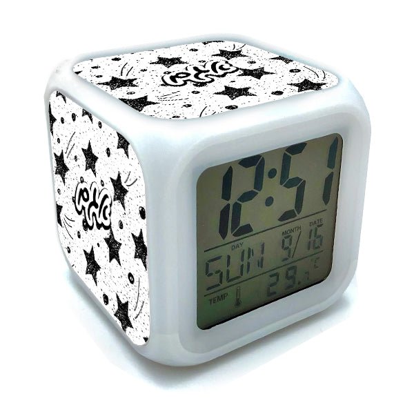 שעון מעורר חכם:צבע בסיס השעון: לבןהשעון כולל 3 צדדים מעוצבים בעיצוב זהה.גודל שעון: 7.9*7.9*7.8 ס"מ