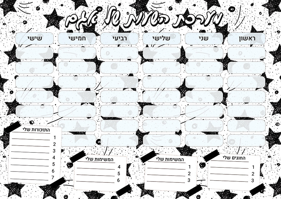 יומן תלמיד שבועי: מערכת שעות + לוח הכפל + אותיות אנגלית